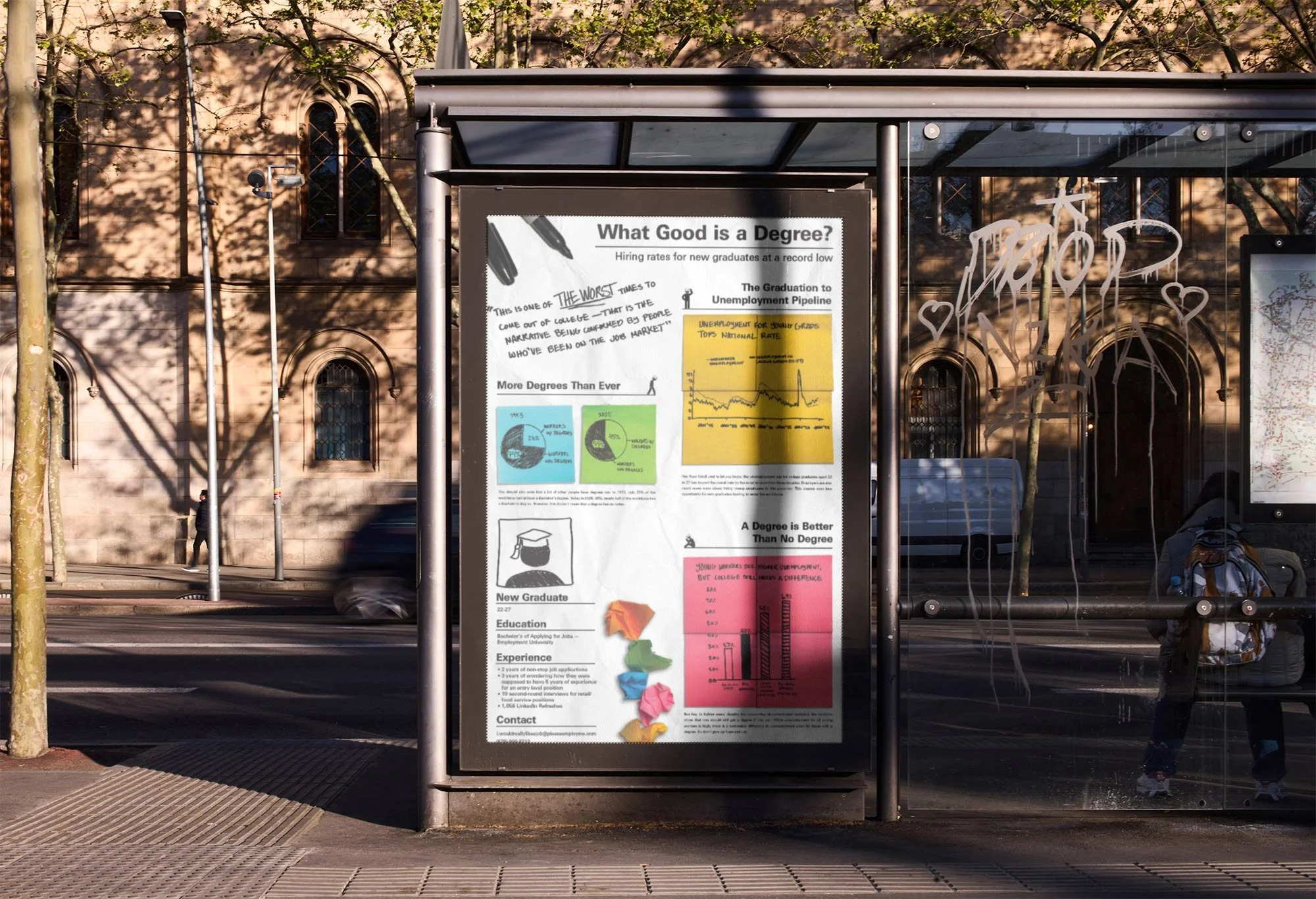 Create a poster and interactive model with infographics covering an important social issue. I opted to cover the current unemployment crisis that new graduates are facing.