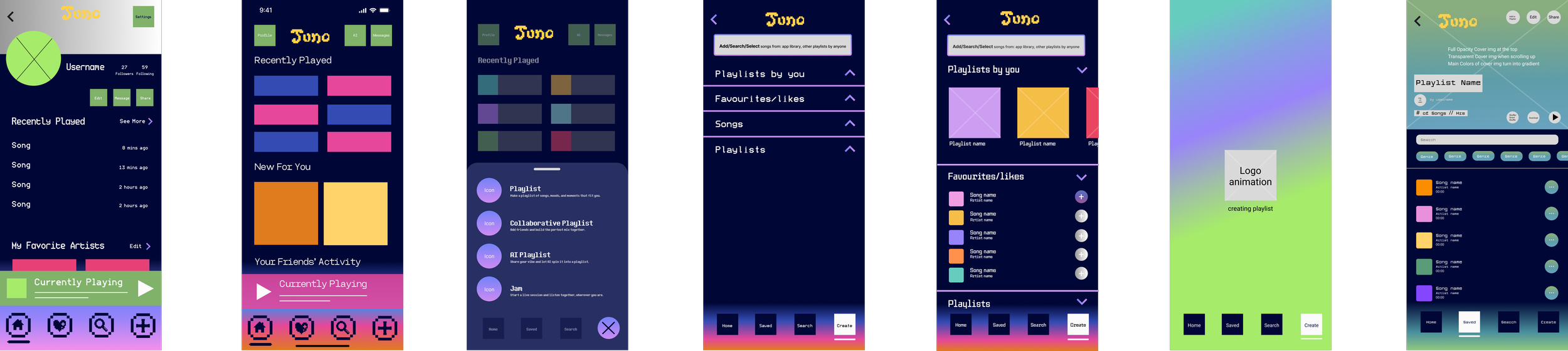 Juno is the result of a semester spent learning the ins and outs of UI/UX design for a mobile prototype. It is a music streaming app that emphasizes that music is meant to be shared. Users are encouraged to look at how they and their friends listen to music, to share that experience, and to talk about that with each other on a single comprehensive app.