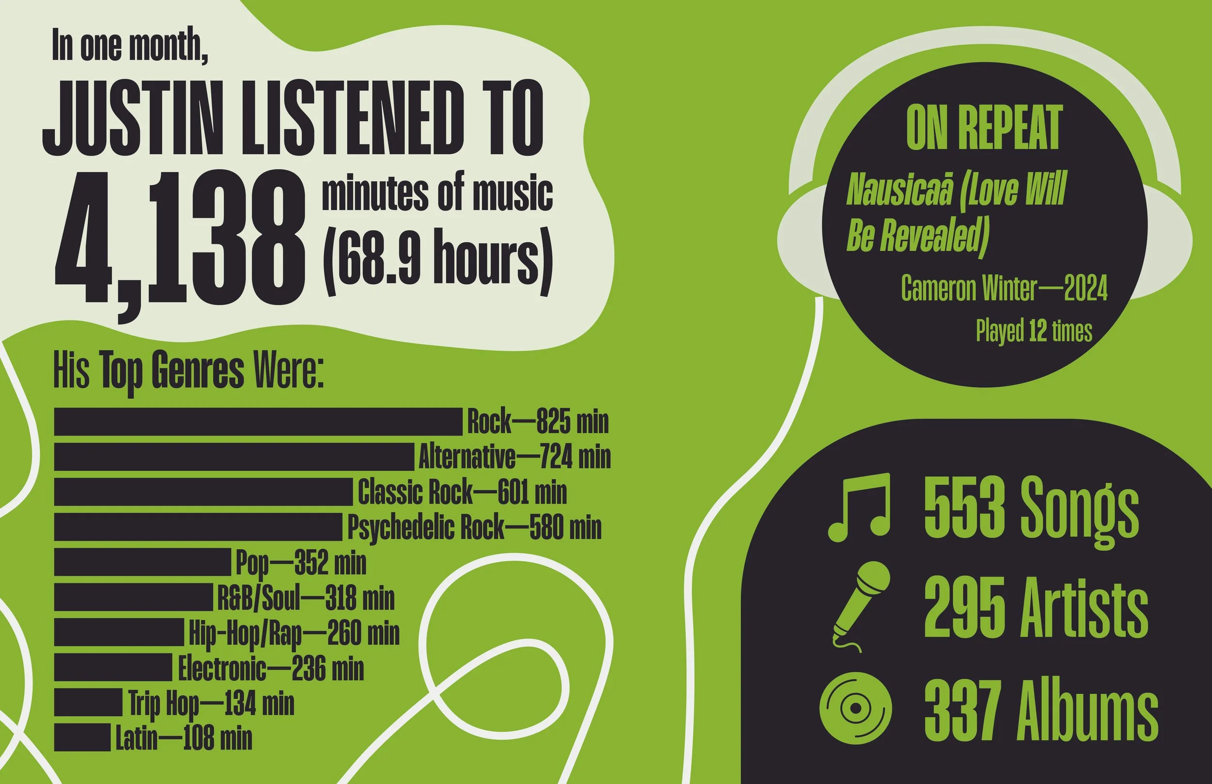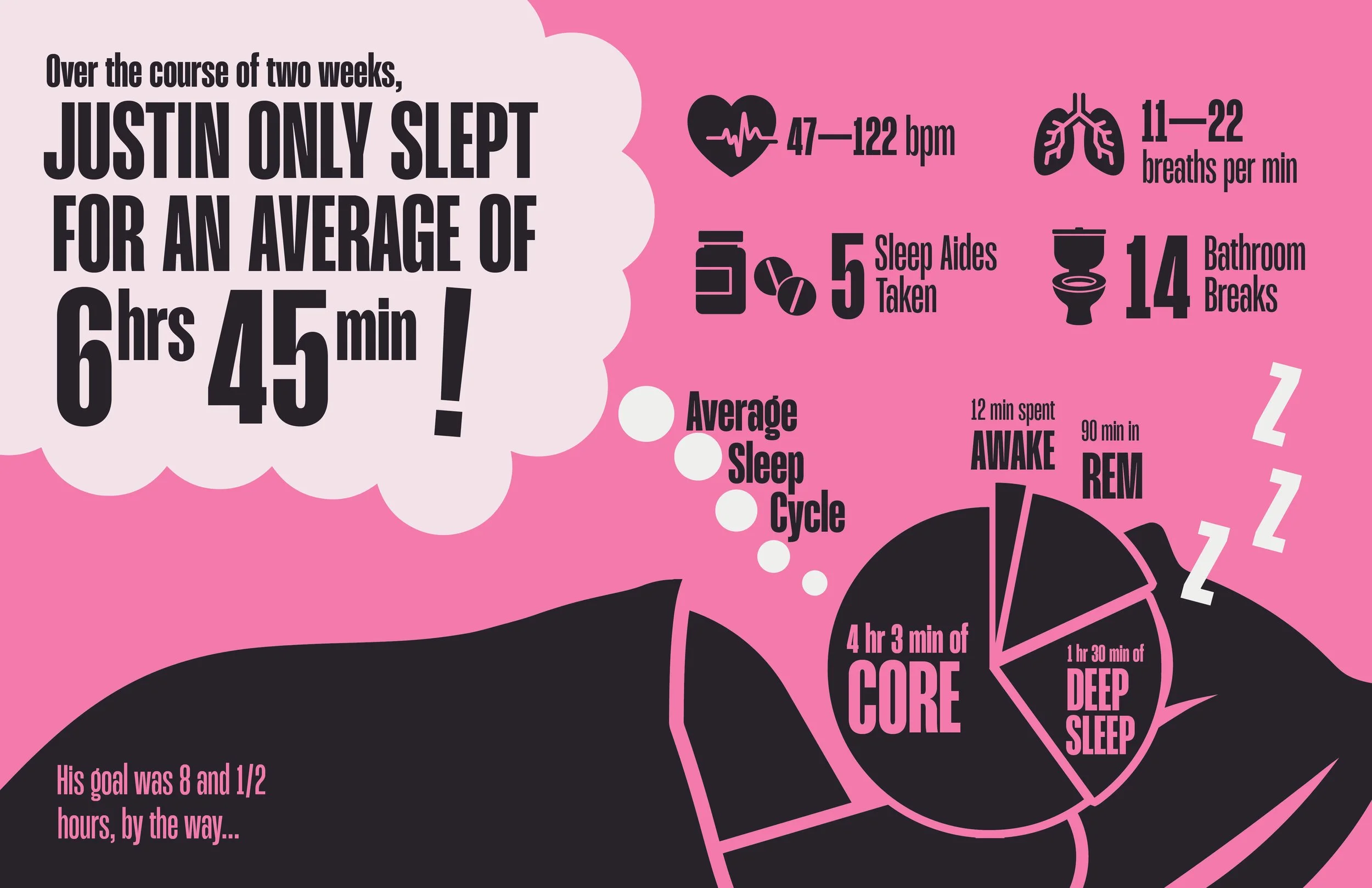 Here, I was tasked with working with infographics in a new way: data from my personal life. The premise of a “data selfie” is that it is a visual representation of statistics from a person’s life in the form of a poster. With this project, I was asked to do three. Besides translating data into a visually-cohesive and digestible format, I found that this process gave me a new insight into how my habits looked and how my routine worked from an outside perspective, and it was fascinating.