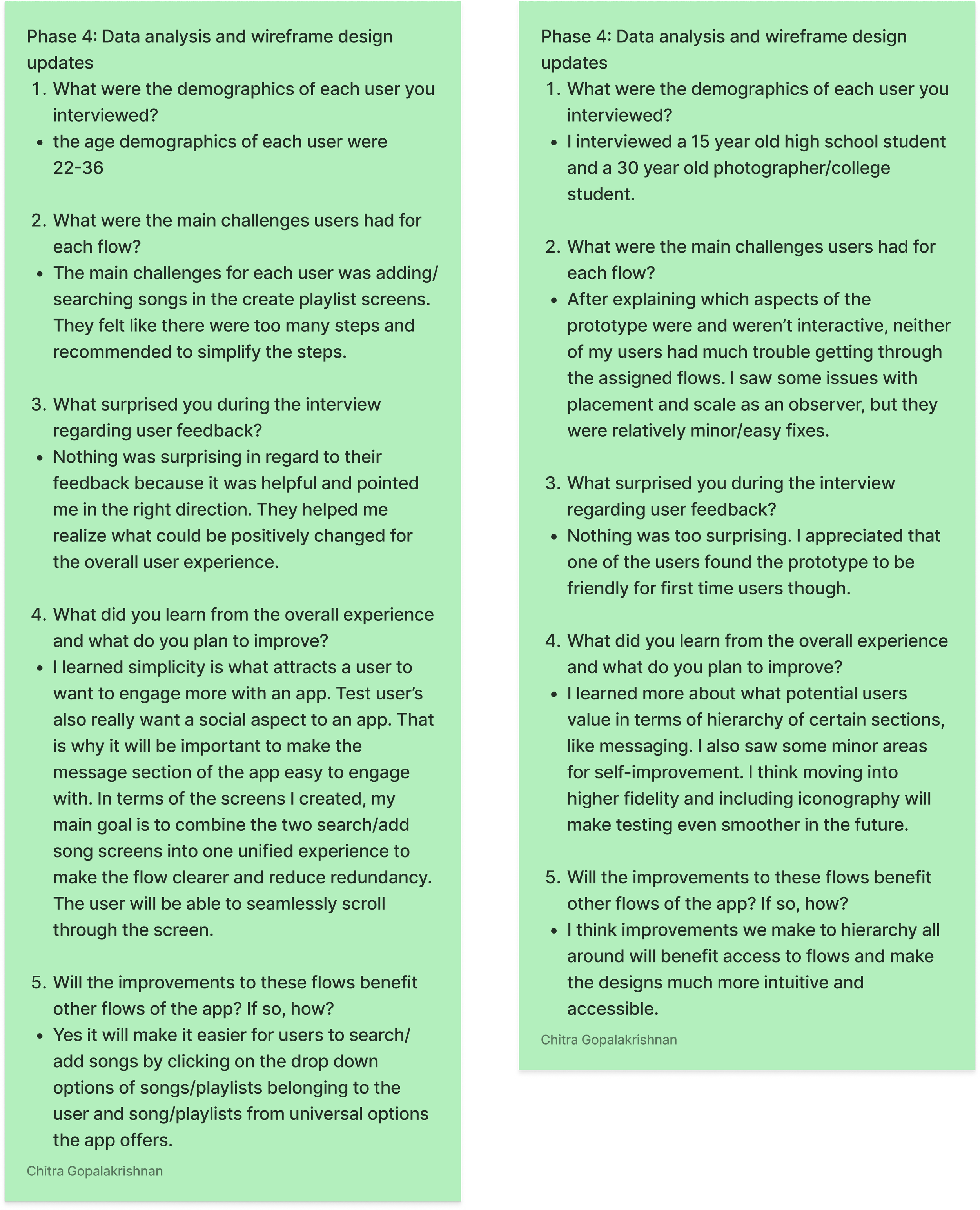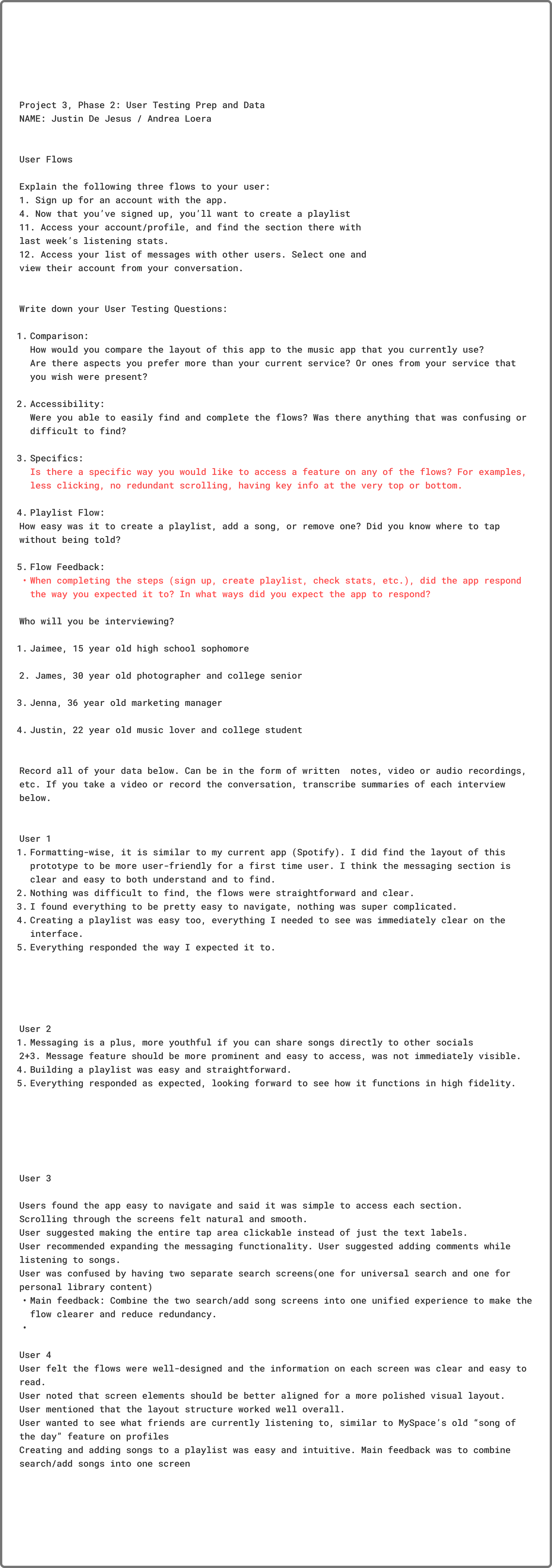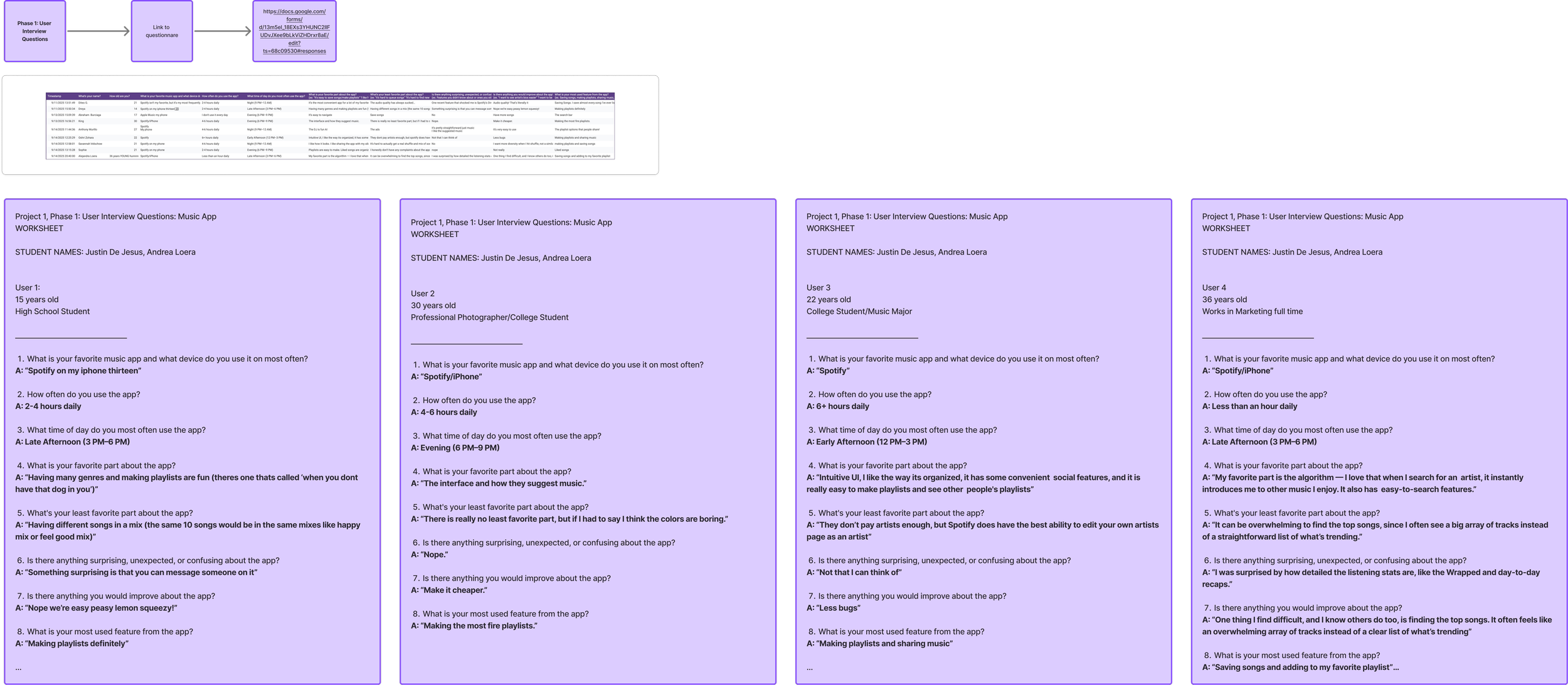 Our first step was interviewing potential users regarding what music streaming app they currently use. It was important to hit a wide age range, as to not receive age-biased data. We interviewed a 15 year old, a 22 year old, a 30 year old, and a 36 year old. We asked questions to discern what they liked and did not like about their current service. This ultimately shaped what kind of niche we wanted our app to hypothetically fill. We noted that the people we interviewed loved the process of making playlists and sharing music the most.