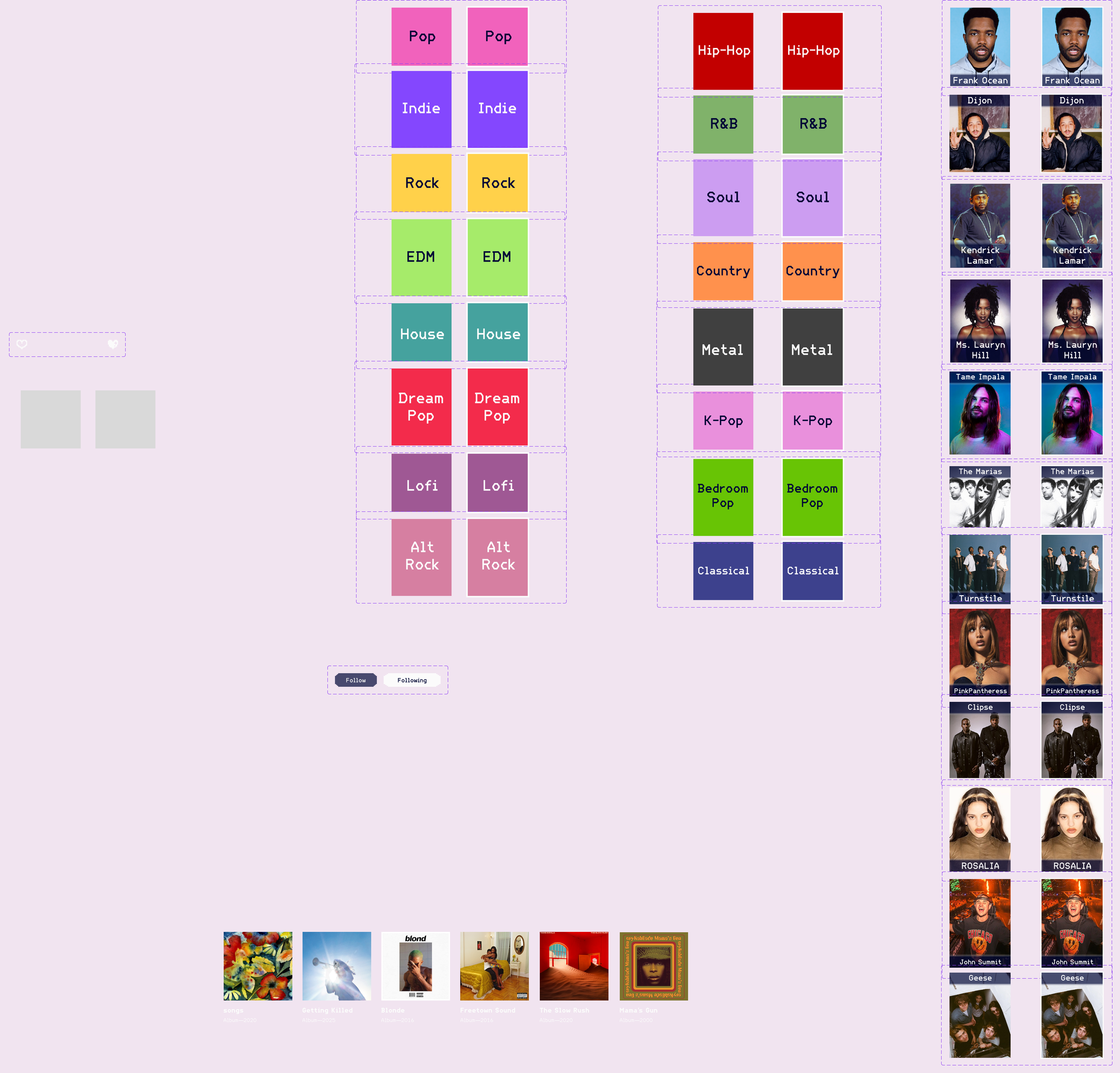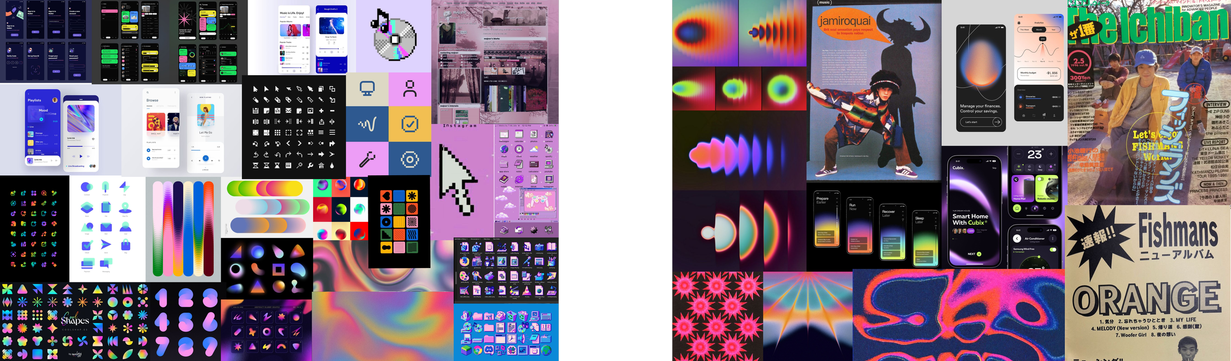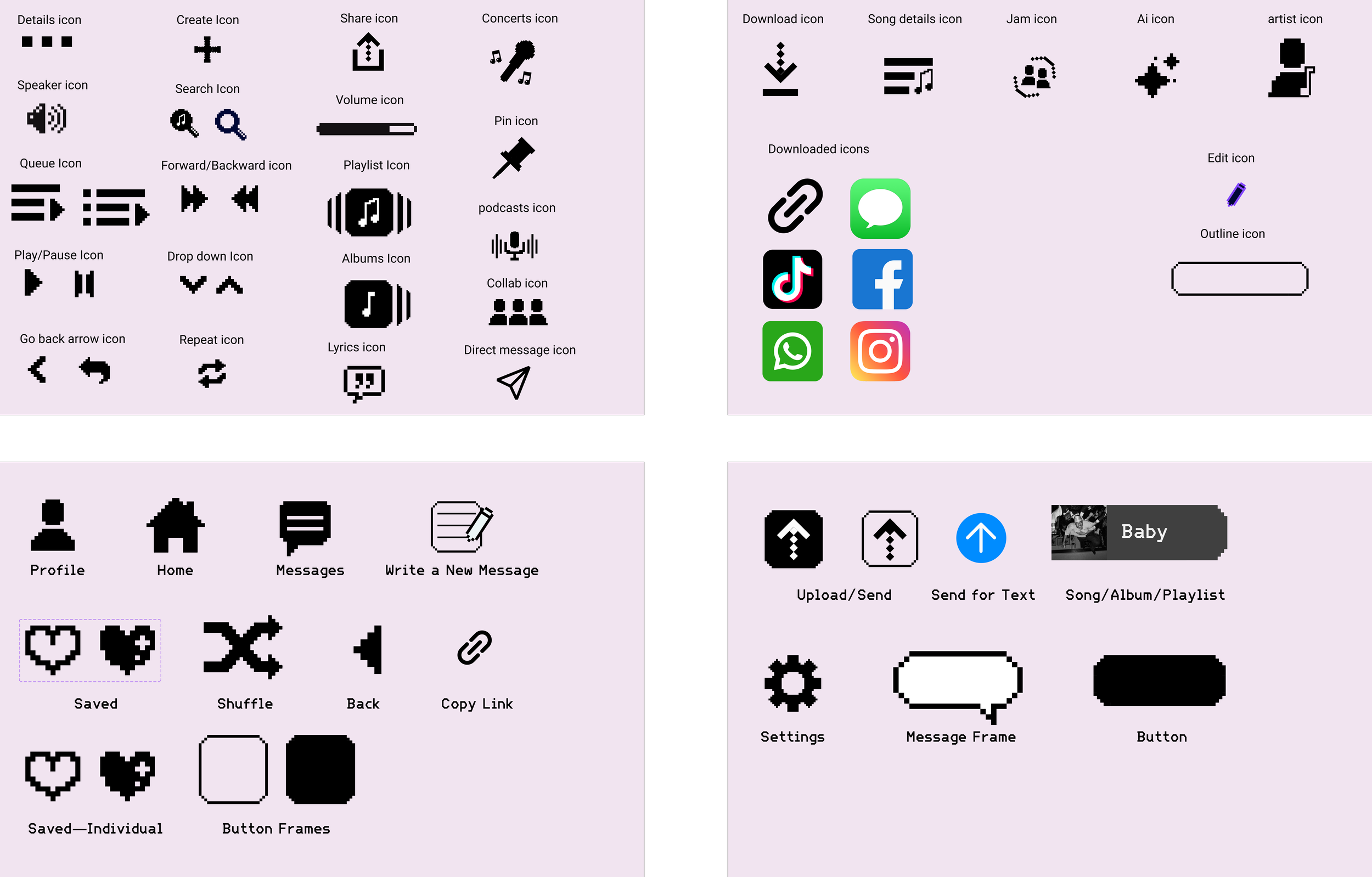 The first step to creating the design system was creating moodboards. My partner and I came to agreement that we wanted the identity of our app to be fun, opinionated, and colorful. We wanted to combine the aesthetics of retro bitmapped design with linear gradients to emphasize that is is an app meant to make listening to and sharing music fun.