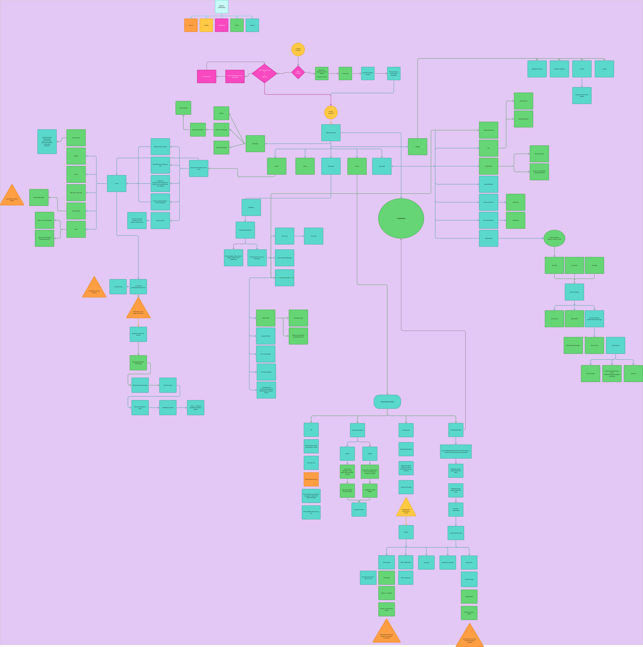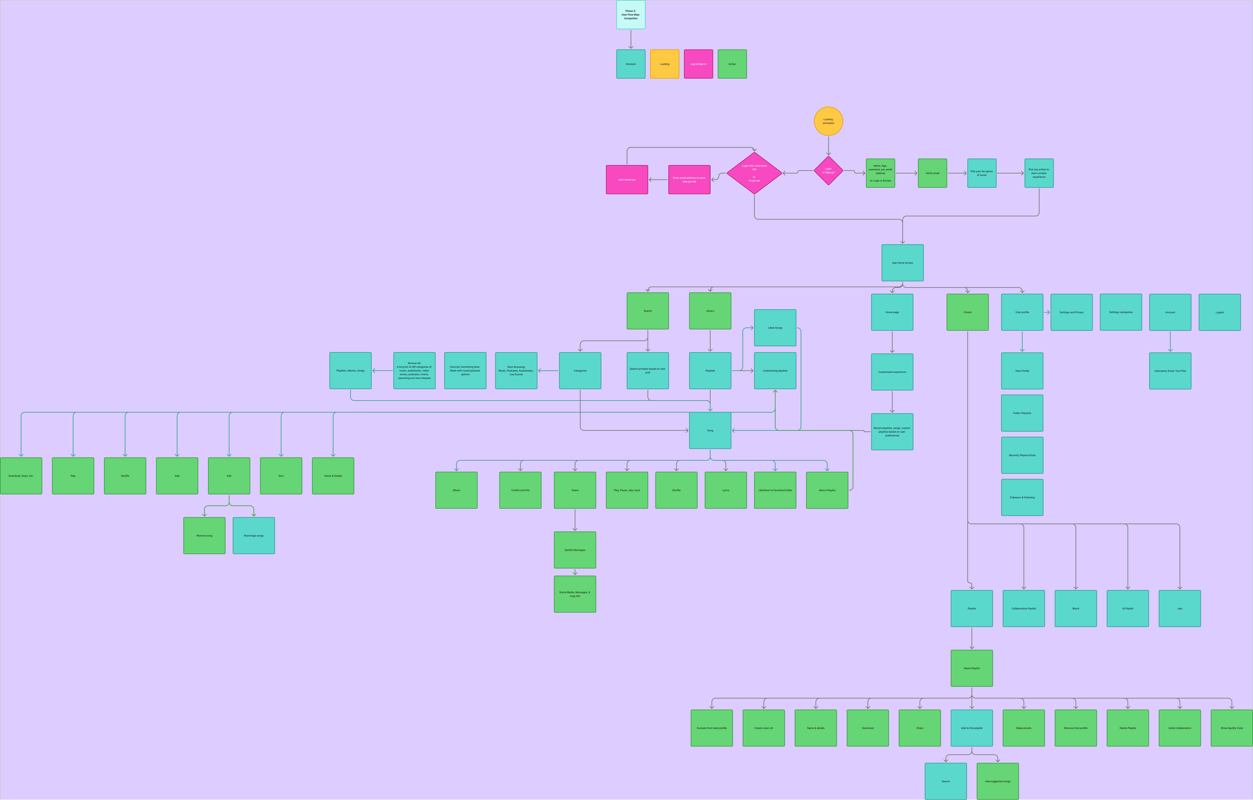 Following the personas, the next step was creating the comprehensive user flow for the app. This would serve as the true skeleton for what was to be built. We used different shapes and colors to differentiate between decisions, actions, pop ups, log-in screens, and loading screens.