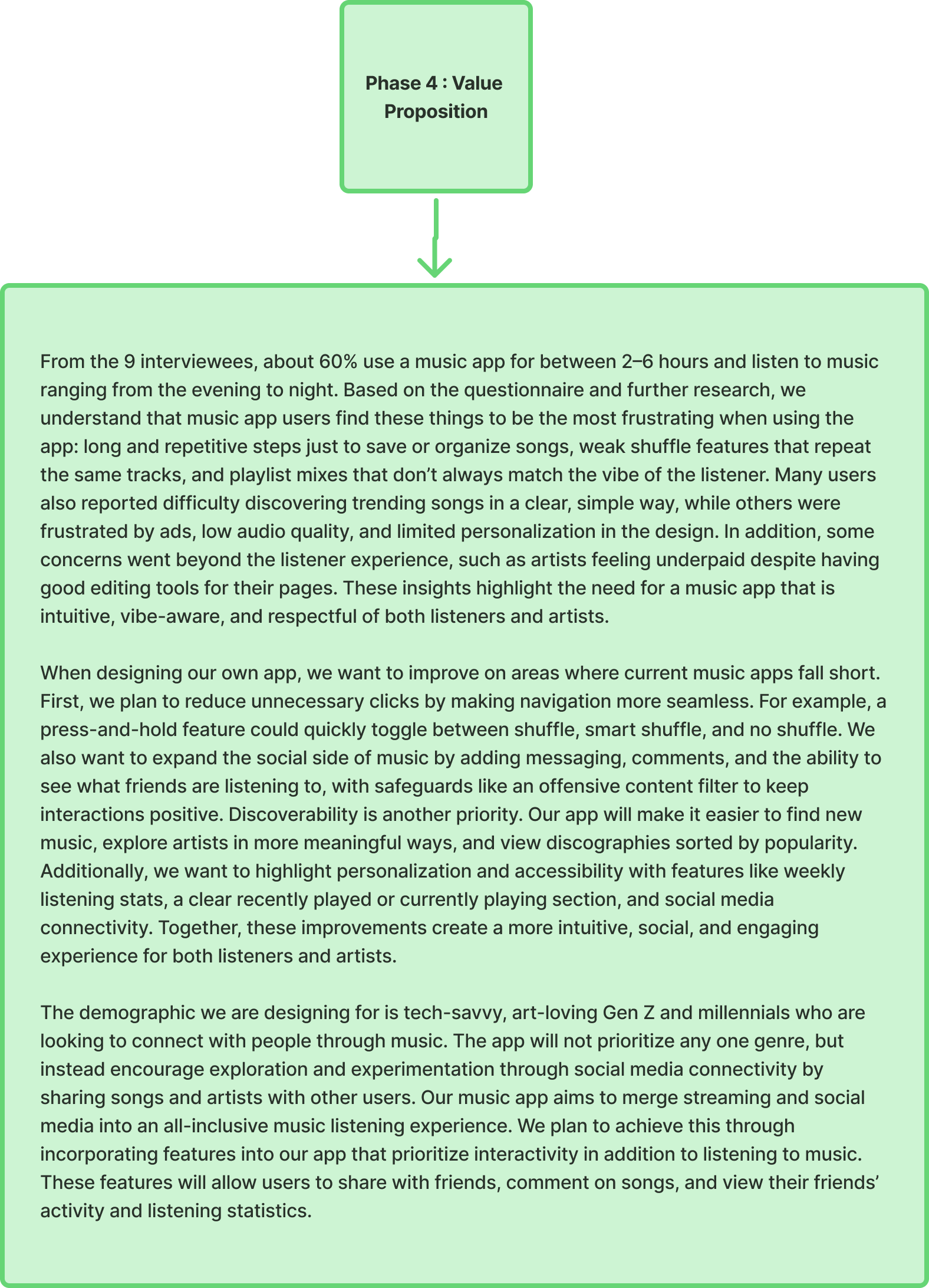 Finally, we ended Project 1 with a value proposition for our app. We needed to articulate why we were creating the app and how it would differ from the competition. Our proposal consisted of a few key points. One: many music apps do not have many social media features built in, and if they do, they are often leaving much room for improvement. Two: we do not want to prioritize a specific genre or style of music, but rather to prioritize the experience of listening to music. This would be done through promoting interactivity both with the app and with the social media features we plan to implement. Features such as messaging systems, and listening stats that are available on all user profiles.