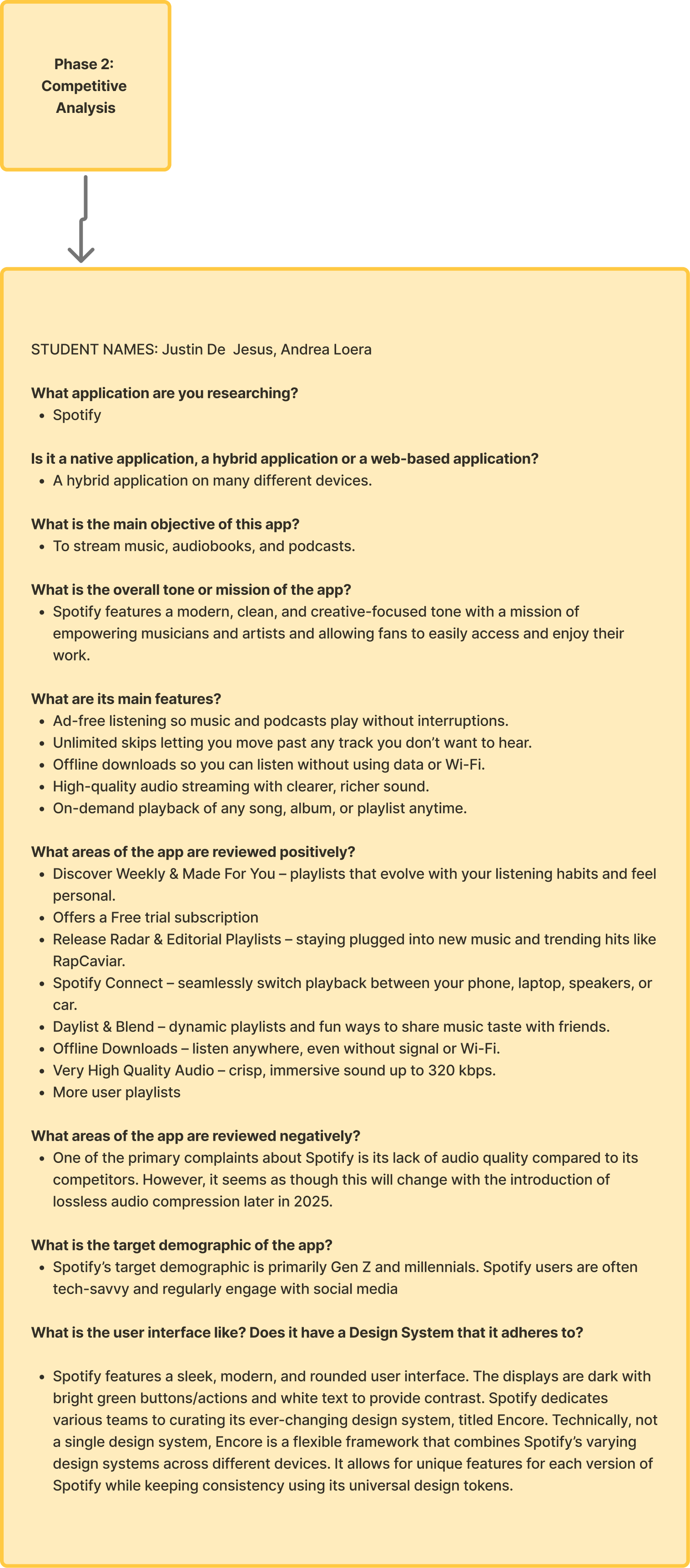 Next, we needed to take a deeper look at our competition. We chose Spotify as it is the most popular music streaming app, and was the service of choice for all of the people we interviewed. We looked into what the overall mission of Spotify is, what makes it successful, its target demographic, and what users feel could be improved.