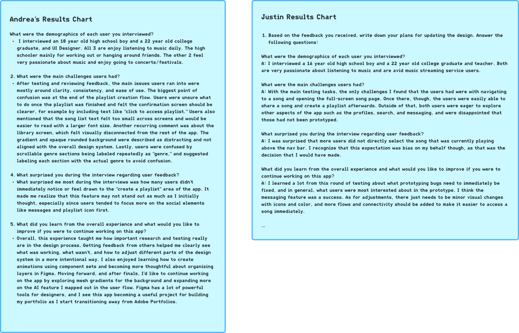 Our testing results found that users were able to, for the most part, easily complete the required flows. The primary hangups we found were in not being able to immediately access a song in multiple different ways, and needing more confirmation that a playlist was created.