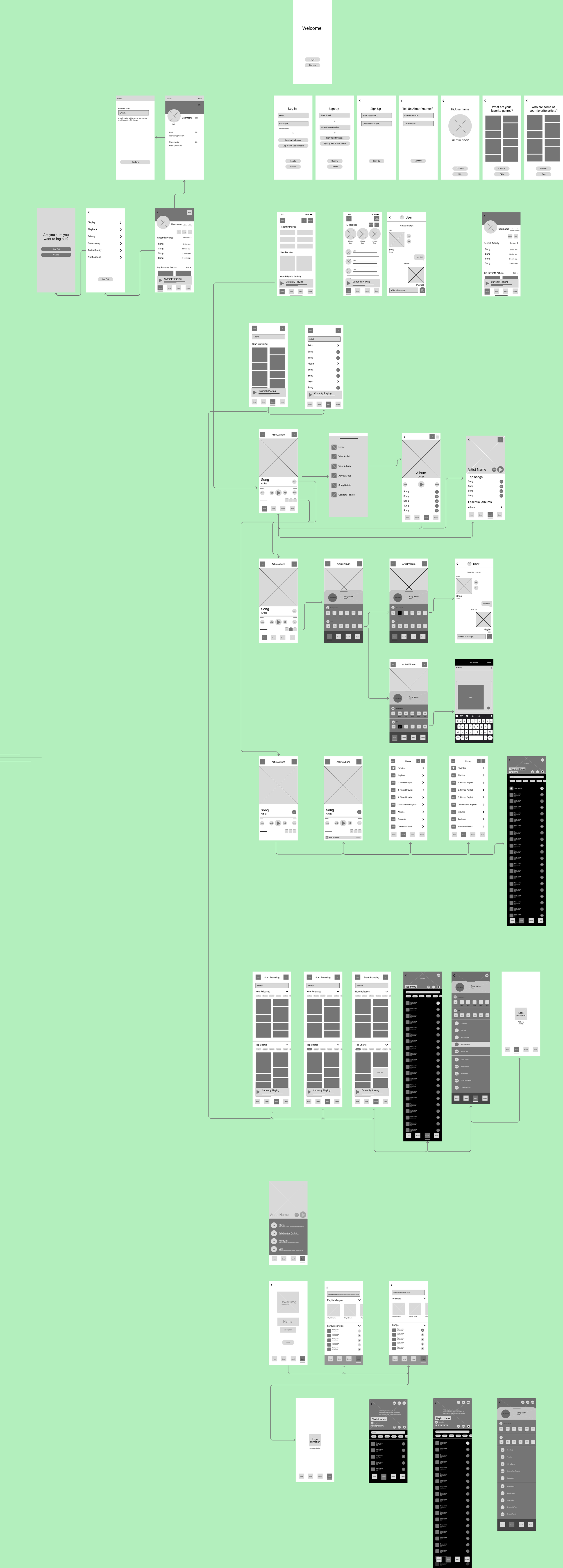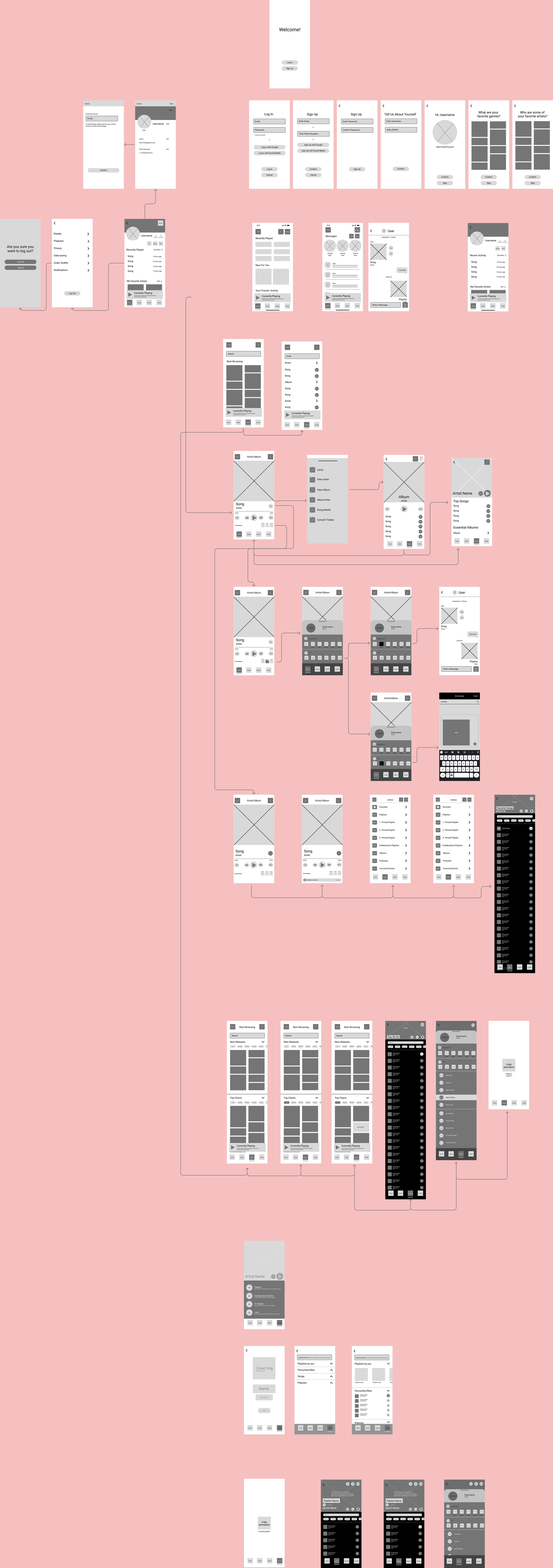 To begin to understand how to create a music app, we first needed to understand how already existing apps functioned. In order to do this, we created a user flow map of Spotify’s most used and most important user flows. This provided us with a framework to reference and ideas of where we could experiment.