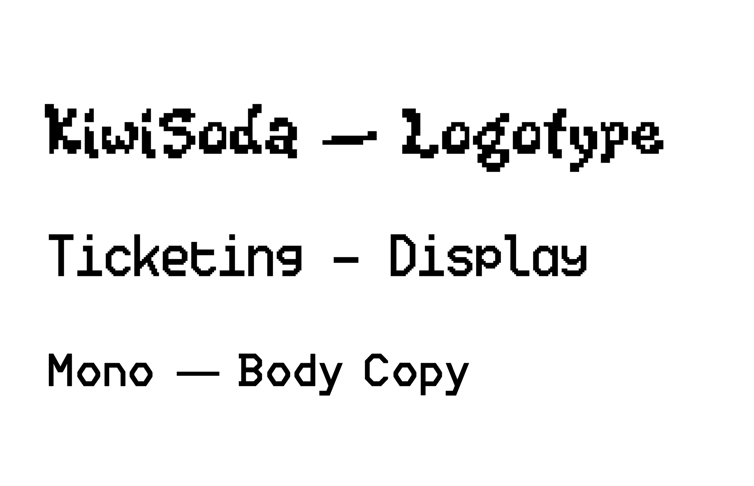 After moodboarding, we looked into dozens of pixelated fonts. Ultimately, we decided on KiwiSoda for a fun and funky logotype, Ticketing for a pixelated display/header font, and Mono for a body copy that was legible but was in line with the bitmapped system.