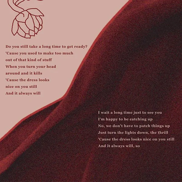 For the Instagram carousel, I shortened the amount of lyrics to just the beginning and chorus to not create too much visual clutter. I considered just rotating the dress, but I felt that the flowing fabric was a better way to connect the three frames. I also included more enlarged floral elements for decoration.