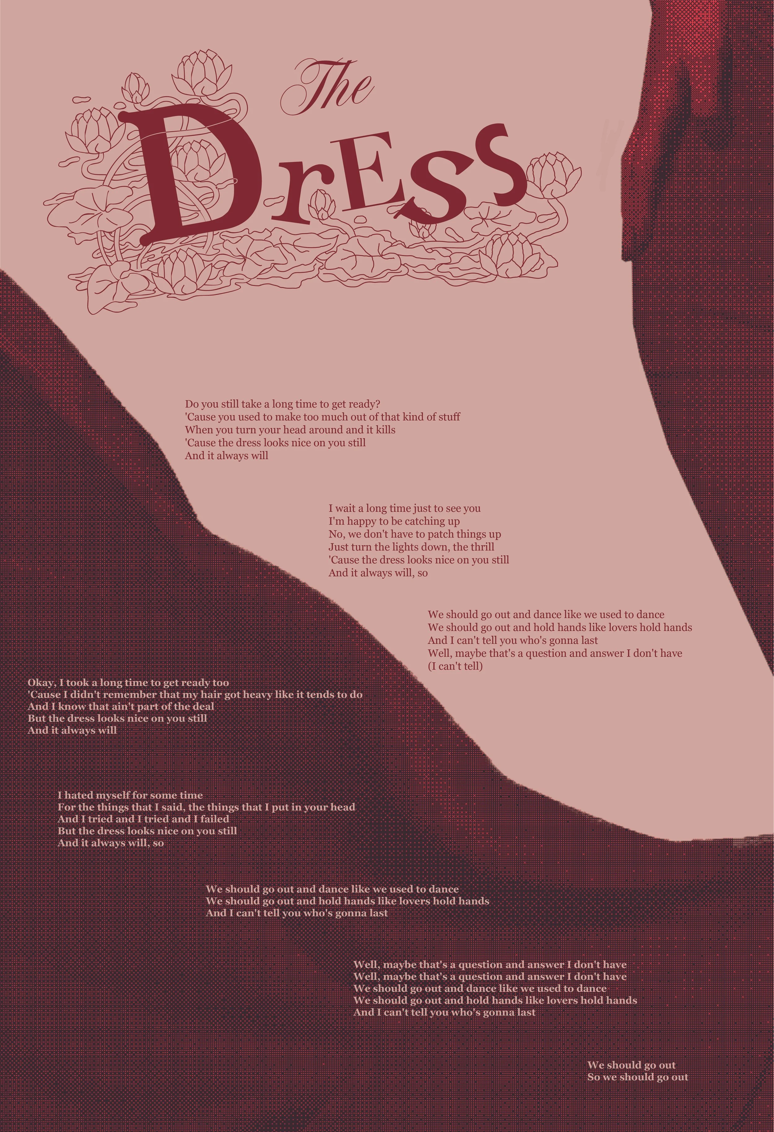 For the final poster, I adjusted the positioning of the letters to exaggerate the concept. I also adjusted the lyrics to fit the curves of the dress, and better accentuate the path down the poster. I went for a noisy image treatment on the dress. I wanted to give it the look that it was a photo taken on film to accentuate the idea that this is a fleeting and perhaps rose-tinted memory.