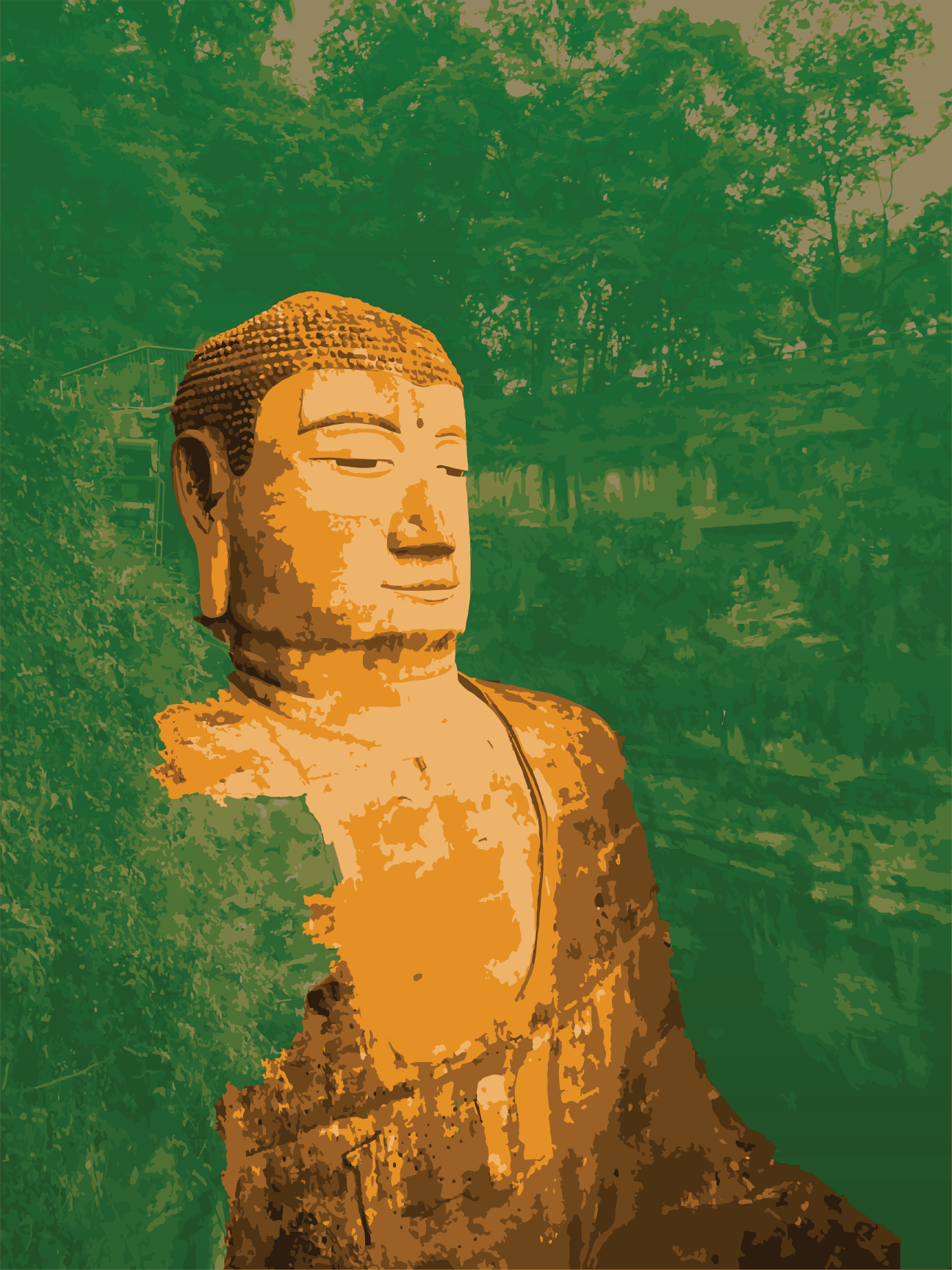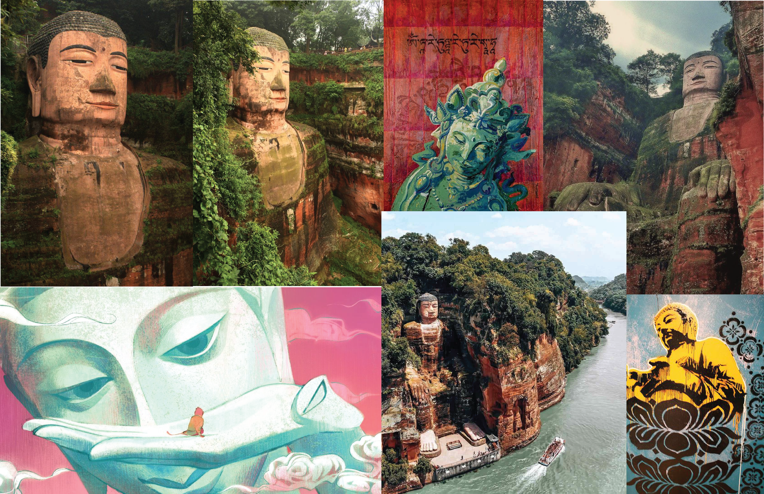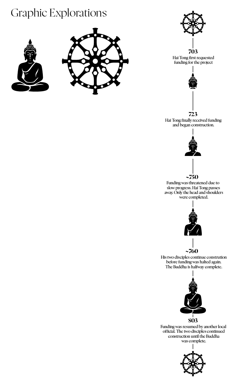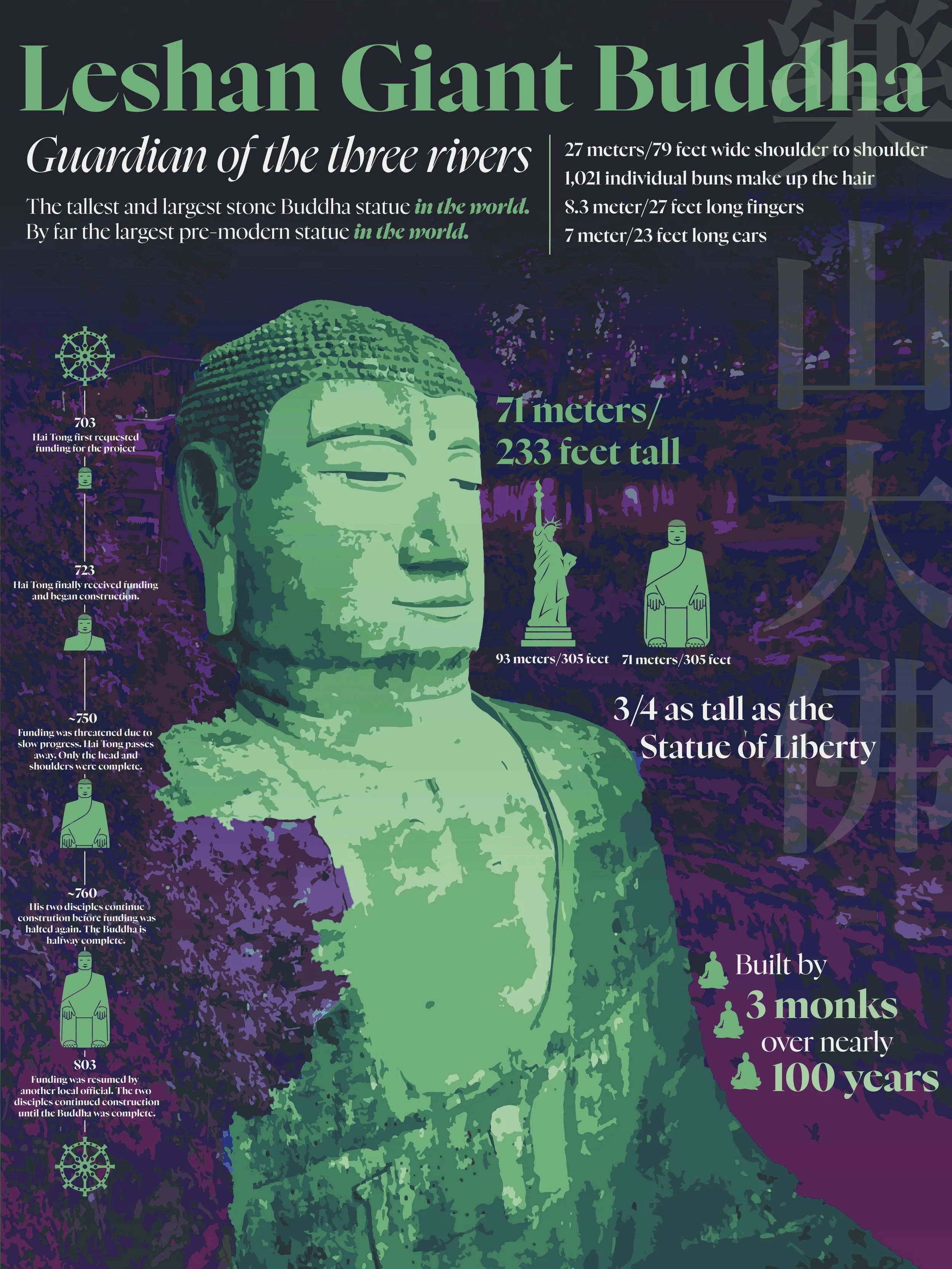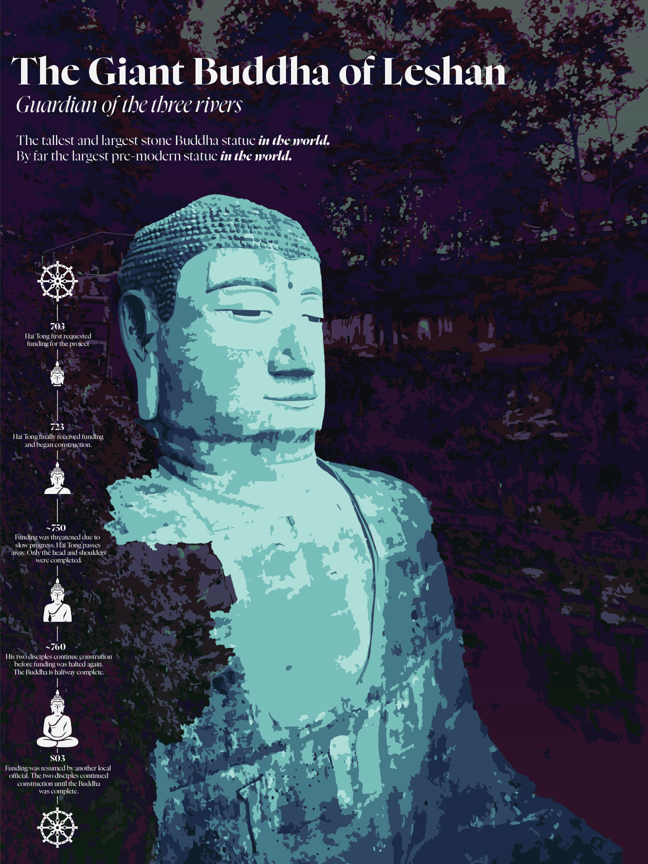 and creating an infographic poster based on it. I faintly remembered seeing images of a giant Buddha statue facing a river in China, and decided to fully delve into it. The Leshan Giant Buddha is a monumental feat of craftsmanship that has remained standing for over 1200 years. Meant to be a guardian of the rivers it faces, I wanted to create an ethereal and tranquil image which reflects that sentiment.